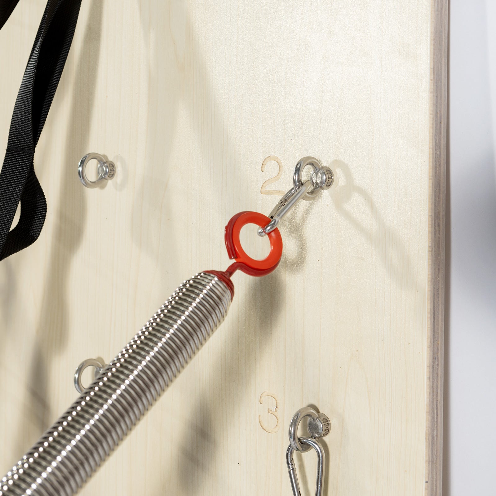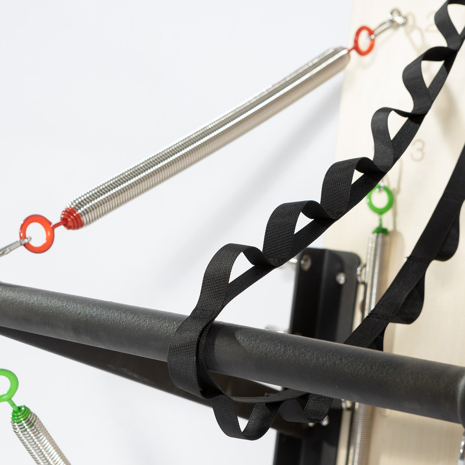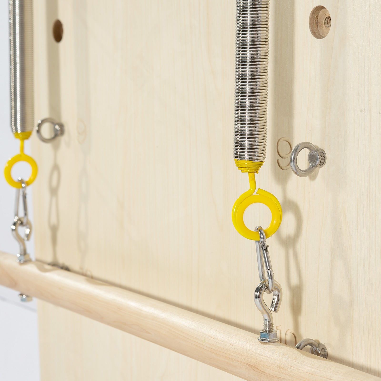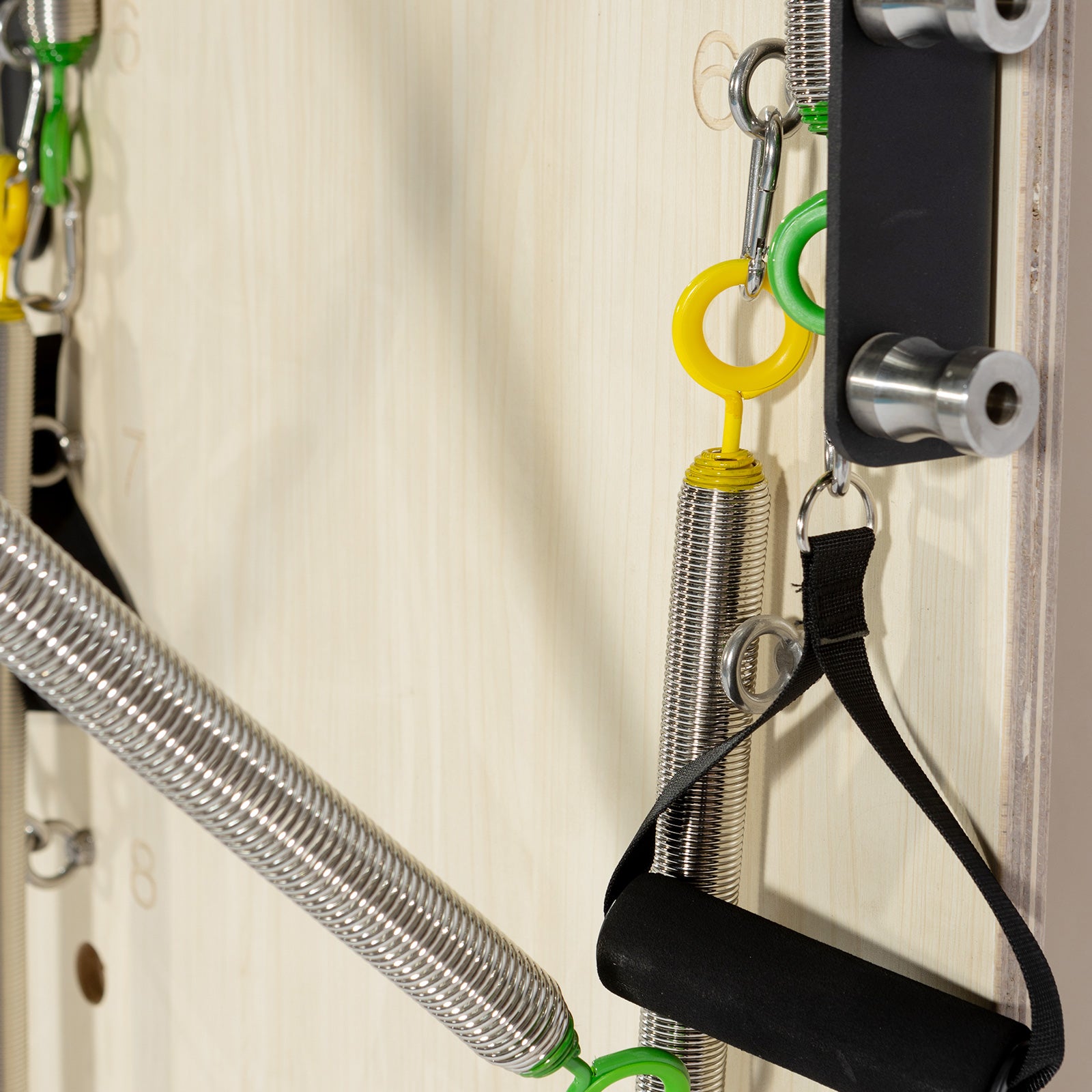 Included Components: Oak spring board with Push-through bar(1 piece); Long spring(4 pieces); Short spring(4 pieces); Hook(16 pieces); Roll down bar(1 piece); Dowel footbar(1 piece); Foot loop(2 pieces); Handle grip(2 pieces); Safety strap with snap(1 piece); Expansion bolts(8 pieces); Assembly kit tools(1 piece)